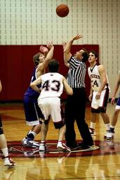 Keywords: basketball jump ball game action ball jump active play sport competition player team referee official sports official high school sports balls athlete stripes gymnasium