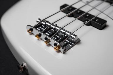 Keywords: bass guitar instrument e bass musical instrument bass guitar strings music stringed instrument electrically fender pickup corpus close up white bridge
