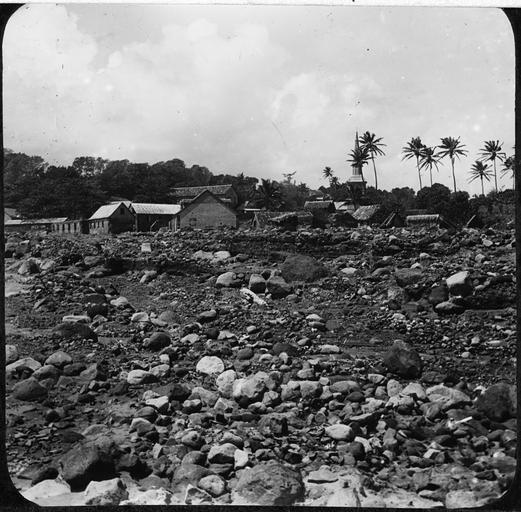 Keywords: Basse Pointe YORYM-TA0306.jpg One slide and one negative The new delta at Basse Pointe - blocks transported by torrrential rain This delta was formed in a few hours as rains associated with the 1902 eruptions swept down large quantities of large debris Village in background - wooden houses some with thatched roofs and church with spire Palm trees depicted people depicted place Basse-Pointe Martinique 1907 Black and White glass Lantern slide Institution Yorkshire Museum Natural History object history exhibition history credit line Yorkshire Museum York Museums Trust accession number YORYM TA306 The Tempest Anderson Photographic Archive held at York Museums Trust <br> York Museums Trust image PD-old-100 PD-US Uploaded with UploadWizard Images from the Tempest Anderson Collection vulcanology 1902 eruption of Mount Pelée 1907 photographs Basse-Pointe |