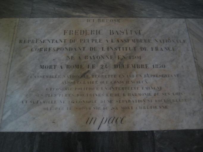 Keywords: Bastiat Tomb.JPG en Photo of Frederic Bastiat's tomb at the San Luigi dei Francesi in Rome Italy Photo de la tombe de Frédéric Bastiat à Saint-Louis-des-Français à Rome Italie Texte ici repose / Frédéric Bastiat / représentant du peuple à l'Assemblée nationale / correspondant de l'Institut de France / né à Bayonne en 1801 / mort à Rome le 24 décembre 1850 / L'Assemblée nationale regrette en lui un représentant / aussi éclairé que consciencieux / l'économie politique un interprète éminent / de ses plus pures doctrines et de l'harmonie de ses lois / et sa famille ne se console d'une séparation si douloureuse / que par le souvenir de sa mort chrétienne / in pace Aaron G Book Agbook 2008-04-13 Frédéric Bastiat San Luigi dei Francesi Rome - Interior Frederic Bastiat French inscriptions in Rome |