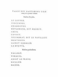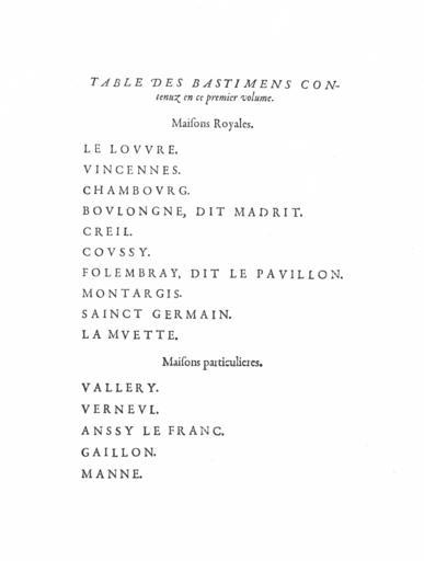 Keywords: Bastiments v1 (Gregg 1972 p03) - TOC.jpg Page of text with the table of contents from Le premier volume des plus excellents Bastiments de France by Jacques I Androuet du Cerceau <br /><--previous page Space 10 next page--> Scan Androuet Jacques 1576 Le premier volume des plus excellents Bastiments de France Paris Reduced size reprint Gregg International 1972 ISBN 9780576154086 1576 Creator Jacques I Androuet du Cerceau PD-old-100 Le premier volume des plus excellents Bastiments de France Gregg 1972 reprint |