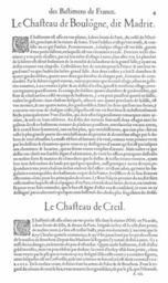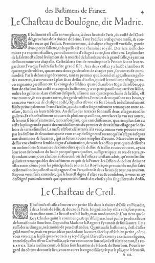 Keywords: Bastiments v1 (Gregg 1972 p09) - Text for Madrid, Creil.jpg Page of text discussing the Château de Madrid and the Château de Creil from Le premier volume des plus excellents Bastiments de France by Jacques I Androuet du Cerceau <br /><--previous page Space 10 next page--> Scan Androuet Jacques 1576 Le premier volume des plus excellents Bastiments de France Paris Reduced size reprint Gregg International 1972 ISBN 9780576154086 1576 Creator Jacques I Androuet du Cerceau PD-Art-100 Le premier volume des plus excellents Bastiments de France Gregg 1972 reprint Château de Madrid Château de Creil |