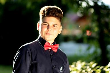 Keywords: bath bow tie young sympathetic smile