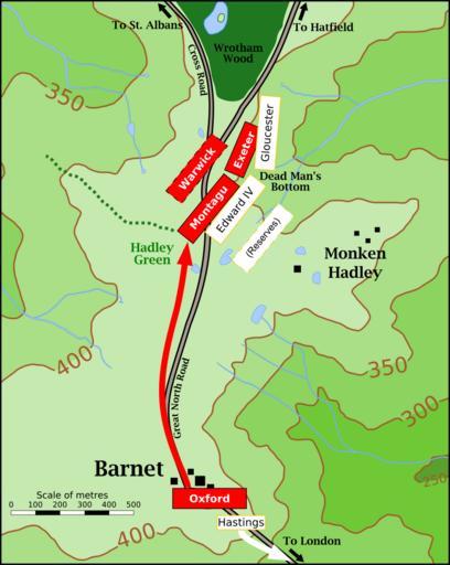 | Keywords: Battle of Barnet, late-battle.svg  en Battlefield map of the Battle of Barnet 14 April 1471 showing a late stage of the engagement Oxford having routed Hastings now returns to the battle but moves into his own allies Base map http //www npemap org uk/tiles/map html 524 196 1 1945 Ordnance Survey New Popular edition maps of Barnet and Monken Hadley Crown copyrights has expiredhttp //www npemap org uk/tileLicence html Terrain details based on http //www british-history ac uk/mapsheet aspx compid 55128 sheetid 5425 England - Middlesex 006 Ordnance Survey 1 10 560 - Epoch 1 1873 Roads derived from Maps 18 and 19 of George Carrington Gray's http //books google co uk/books id UMMHAAAAQAAJ New Book of Roads Sherwood Jones and Co 1824 Deployment based on cite book Burne Alfred The Battlefields of England http //books google com/books id IzwOAAAAQAAJ p 110 2009-02-08 1950 Methuen and Company London The Battle of Barnet April 14th 1471 http //books google com/books id IzwOAAAAQAAJ pg PA108 cite book Gravett Christopher Tewkesbury 1471 The last Yorkist victory http //books google com/books id ok1Ql8fCLKAC pp 38 39 2009-01-16 Campaign 131 2003 Osprey Publishing Oxford 1-84716-514-7 Jappalang 2009-03-12 Battle of Barnet |