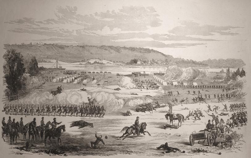 Keywords: monochrome outdoor (from Frank Leslie's Illustrated History of the Civil War..., edited by Louis Shepheard Moat, Published by Mrs. Frank Leslie, New York, 1895) "Explanation.-1. Brigadier General Grant and staff directing the movements of the troops. 2. Brigadier General McClernand leading the charge at the head of the Thirty-first Illinois. 3. Thirty-first Illinois, Colonel Logan. 4. Body of Lieutenant Colonel Wendtz, Seventh Ohio. 5. Body of Captain Pulaski, aid-de-camp to McClernand, killed while leading the charge. 6. Caisson ordered to the field from the rear. 7. Twenty-seventh Illinois, Colonel Buford, taking the camp colors of the Confederates. 8. Thirtieth Illinois, Colonel Fouke. 8 A. Twenty-second Illinois, Colonel Dougherty. 9. Light artillery, Captain Taylor. 10. Seventh Ohio, Colonel Lamon. 11. Captain Schwartz, acting chief of artillery, taking the Confederate battery. 12. Watson's Louisiana field battery. 13. Confederate artillery horses. 14. Battery of heavy ordnance at Columbus. 15. Encampment near Columbus. 16. Confederate ferryboat. 17. Columbus." (from Frank Leslie's Illustrated History of the Civil War..., edited by Louis Shepheard Moat, Published by Mrs. Frank Leslie, New York, 1895) "Explanation.-1. Brigadier General Grant and staff directing the movements of the troops. 2. Brigadier General McClernand leading the charge at the head of the Thirty-first Illinois. 3. Thirty-first Illinois, Colonel Logan. 4. Body of Lieutenant Colonel Wendtz, Seventh Ohio. 5. Body of Captain Pulaski, aid-de-camp to McClernand, killed while leading the charge. 6. Caisson ordered to the field from the rear. 7. Twenty-seventh Illinois, Colonel Buford, taking the camp colors of the Confederates. 8. Thirtieth Illinois, Colonel Fouke. 8 A. Twenty-second Illinois, Colonel Dougherty. 9. Light artillery, Captain Taylor. 10. Seventh Ohio, Colonel Lamon. 11. Captain Schwartz, acting chief of artillery, taking the Confederate battery. 12. Watson's Louisiana field battery. 13. Confederate artillery horses. 14. Battery of heavy ordnance at Columbus. 15. Encampment near Columbus. 16. Confederate ferryboat. 17. Columbus." |
