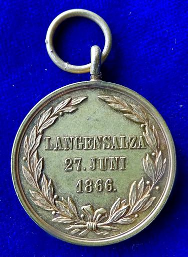 Keywords: Battle of Langensalza (1866) Hanoverian Medal, reverse.jpg en Gilt bronze d 36 mm George V King of Hanover 1851-1866 He was the grandson of King George III of Great Britain As a legitimate male-line descendant of George III he remained a member of the British Royal Family and second in line to the British throne until the birth of Queen Victoria's first child Victoria Princess Royal in 1840 Contrary to the wishes of the parliament Hanover joined the Austrian camp in the war As a result the Prussian army occupied Hanover and the Hanoverian army surrendered on 29 June 1866 the King and royal family having fled to Austria The Prussian government formally annexed Hanover on 20 September but the deposed King never renounced his rights to the throne or acknowledged Prussia's actions From exile in Gmunden Austria George V appealed in vain for the European great powers to intervene on behalf of Hanover Head l around GEORG V v G G KOENIG v HANNOVER /3 lines between 2 laurel branches LANGENSALZA 27 JUNI 1866 Edge letttering C RÖHRS v Heyden 235 Medallist Heinrich Jauner 1833 Wien - 1912 Vienna Austria Condition UNCIRCULATED 1866-07-27 own Berlin-George other versions cc-by-sa-4 0 PD-old-100 PD-1923 Medals of Germany Hannover 1866 medals Battle of Langensalza 1866 |
