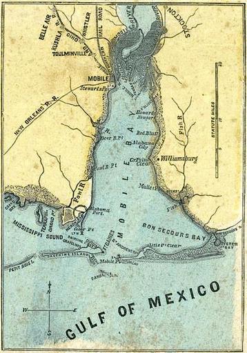 | Keywords: Battle of Mobile Bay map.jpg Short Title H H Lloyd Co's Campaign Military Charts Showing The Principal Strategic Places Of Interest map of w Mobile Bay Date 1861 Author Lloyd H H ; Viele Egbert L ; Haskins Charles <br> Publisher New York H H Lloyd Co Format File is in JPEG format 10x-20x times faster than Portable Network Graphics PNG -format files due to auto-resizing as a smaller file 10-Feb-07 Full Title H H Lloyd Co's Campaign Military Charts Showing The Principal Strategic Places Of Interest Engraved Expressly To Meet A Public Want During The Present War Compiled From Official Data By Egbert L Viele Military and Civil Engineer; and Charles Haskins Published Under The Auspices Of The American Geographical And Statistical Society Entered 1861 by H H Lloyd Co H H Lloyd Co's Military Charts Sixteen Maps On One Sheet Source http //www davidrumsey com Variations Portable Network Graphics PNG -format file same width 420x600 10x larger file Image Battle of Mobile Bay map png 587 kilobyte KB Map labels clockwise from top Northern bay Mobile River Tensaw River Appalacha River D'Olive's Bay Batteau Bay Tensaw R Levons B Polecat Bay Blakely I Mobile River Mobile R ; Eastern shore Stockton AL Stockton D'Olive's Bay Howards Newport Fish River Red Bluffs Alabama City Williamsburg Point Clear AL GrPoint Clear Mullet Point Weeks' Bay Fish River Fish R Bon Secour s R iver ; Bottom bay Oyster Bay Bon Secour s Bay Litle Pt Clear St Andrews Bay L<sup>T</sup> H Fort Morgan Ft Morgan Mobile Pt Sand I sland / L H Fort Gaines F<sup>T</sup> Gaines Pelican Bay Dauphin Island Dauphine I Bay Gravelines Dauphin Island Dauphine Island Petit Bois Island Petit Bois I sland MISSISSIPPI SOUND; Western shore Grand Bay AL Grand Bay Terrapin Grand Pt Heron Bay L<sup>T</sup> H Cedar Pt Alabama Port Fowl River Fowl R iver Fowl R Pt Deer R iver Pt Dog R iver New Orleans R R railroad Stewarts Pav L<sup>T</sup> H Mobile AL MOBILE Mobile and Ohio R R railroad Gt Northern Rail Road Toulminville Whistler AL Whistler Kushla Belair AL Belle Air Transferred from http //en wikipedia org en wikipedia to Commons by User Undead_warrior using http //tools wikimedia de/~magnus/commonshelper php CommonsHelper 100px PD-old Original upload log en wikipedia Battle_of_Mobile_Bay_map jpg 2007-02-10 18 18 Wikid77 420×600× 61245 bytes <nowiki>Short Title H H Lloyd Co's Campaign Military Charts Showing The Principal Strategic Places Of Interest map of Mobile Bay Author Lloyd H H ; Viele Egbert L ; Haskins Charles Date 1861 Short Title H H Lloyd Co's Campaign Mili</nowiki> Old maps of Mobile Alabama during the American Civil War Mobile Bay Barrier islands of the United States Maps by Egbert Ludovicus Viele |