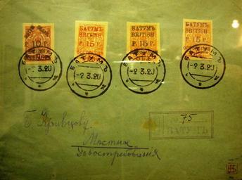 Keywords: Batum letter 2March1920.JPG A cover with British Batumi occupation overprint stamps cancelled 2 March 1920 Конве т с гашением 2 3 1920 года ма ок с надпечаткой б итанской оккупации г Батуми Own 2008-01-27 Leonid Dzhepko product of a long-defunct government PD-old Stamps of Batumi 1920 stamps Overprints on stamps of the Russian Empire Stamps of Russia on covers and postcards |