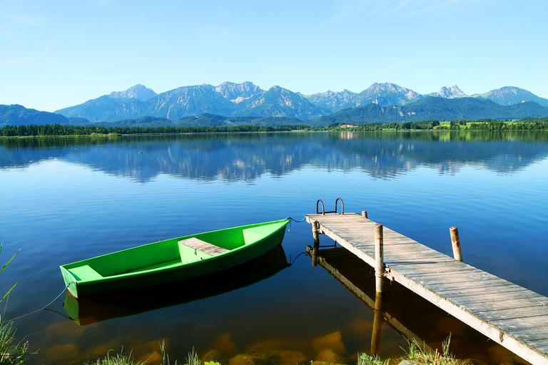 Keywords: bavaria allgäu lake mountains water nature germany summer leisure holiday recovery idyll horizontal in the free rest landscape blue morning rowing boat web boot pier boardwalk fishing boat