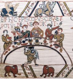 | Keywords: Bayeux Tapestry scene43 banquet Odo.jpg Tapisserie de Bayeux - Scène 43 l'évêque Odon bénit le premier banquet que le duc Guillaume et ses barons normands tiennent sur le sol anglais L'évêque se reconaît à sa tonsure ainsi qu'au poisson posé devant lui <br>Légende en latin ET HIC EPISCOPUS CIBUM ET POTUM BENEDICIT Et ici l'évêque bénit la nourriture et la boisson Bayeux Tapestry - Scene 43 Bishop Odo blesses the first banquet that Duke William and the Norman Barons hold on English soil The bishop is recognisable by his tonsure and also by the fish in front of him <br>Titulus ET HIC EPISCOPUS CIBUM ET POTUM BENEDICIT And here the bishop blesses the food and drink own Myrabella s 1070 - Photograph 2013-03-07 49 2742 -0 7005 QualityImage Licensed-PD-Art PD-old-100-1923 CC-zero Bayeux Tapestry Banquets in art Blessing in art Bishops in art Latin inscriptions in art Quality images of paintings Quality images of Calvados Quality images by Myrabella U shaped tables |