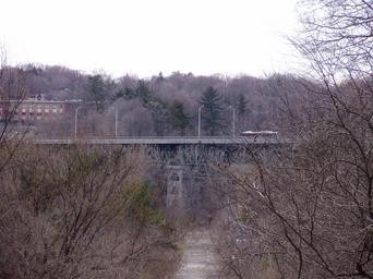 Keywords: Bayview Bridge from Lawrence.jpg en A Toronto Transit Commission bus crosses over the Bayview Bridge built across the West Don River in Toronto Ontario Canada Photographed from Lawrence Avenue East in the Bridle Path Own GTD Aquitaine 2009-04-11 Road bridges in Toronto Don River Ontario |