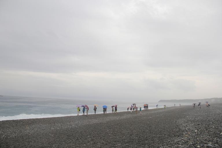 Keywords: beach cloudy day the wind blows several people along the coast mysterious and beautiful
