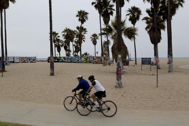 Keywords: beach cyclists people leisure sea venice beach california usa activity healthy ocean palm trees sand lifestyle bicycles cycling bikes sport