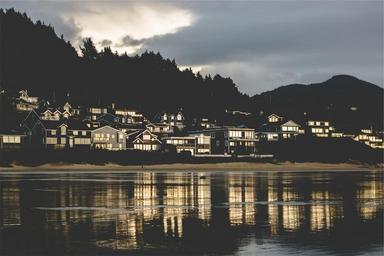 Keywords: beach houses shore coast water reflection night sky evening silhouette