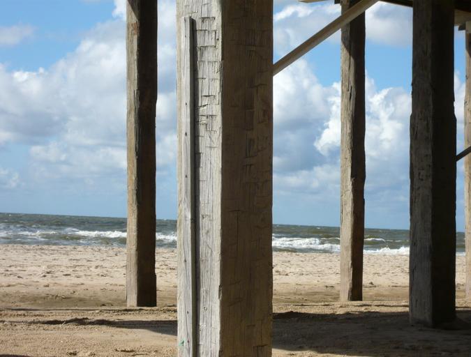 Keywords: beach post light shadow sand denmark north sea water sea wooden beams