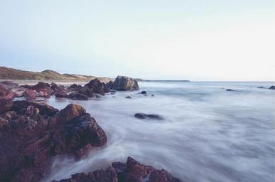 Keywords: beach sand rocks boulders water ocean sea shore coast