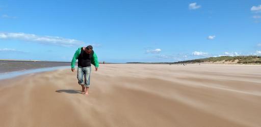 Keywords: beach sand sea summer idyllic shore beach sand horizon water sky relax sandstorm person man on beach
