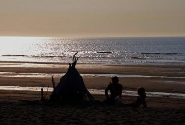 Keywords: beach sea holiday human child abendstimmung evening light lighting atmosphere recovery rest idyll back light sunlight silhouette sand beach north sea wave swim tent wigwam play concerns