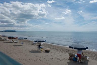 Keywords: beach sea parasols island sand water coast horizon clouds blue view sky maremma italy
