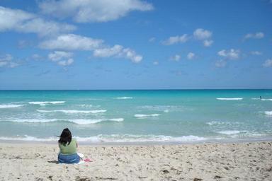 Keywords: beach women thinking sea sky miami clouds costa blue soledad