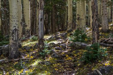Keywords: abineau-bear jaw loop abineaubearjawloop arizona bear jaw trail bearjawtrail bear jaw trail #26 bearjawtrail26 bear jaw trail no. 26 bearjawtrailno26 coconino national forest coconinonationalforest flagstaff ranger district flagstaffrangerdistrict forest service forestservice san francisco mountain sanfranciscomountain san francisco peaks sanfranciscopeaks u.s. forest service usforestservice usfs fall fall color fallcolor fall colors fallcolors fall foliage fallfoliage flagstaff forest hiking outdoors trail outdoor landscape plant tree Fall color September 25, 2016 in the upper end of Bear Jaw Canyon, Bear Jaw Trail. Trees are approximately half turned, with some groups peaking or approaching peak color. Lower elevations of the trail are mostly green. Expect peak season through the first weekend of October on the upper end of the trail, and through the first week of October for the lower end of the trail. Abineau Trail is a steep 1,800 foot climb over two miles up the slopes of the San Francisco Peaks through Abineau Canyon. The trail meets the Waterline Trail at the top, which can be followed down to Bear Jaw Trail to return to the trailhead. Each leg of the loop is approximately two miles long, plus a 0.4 mile connector trail from the trailhead to the loop, making a total loop hike of approximately seven miles. The loop is one of the quintessential autumn hikes in the San Francisco Peaks. Aspens along all three legs of the loop turn gold, and falling leaves carpet the forest floor and decorate the conifers. Photo by Deborah Lee Soltesz, September 25, 2015. Credit: U.S. Forest Service, Coconino National Forest. For more information about this trail, see the Abineau-Bear Jaw Loop trail description on the Coconino National Forest website. Fall color September 25, 2016 in the upper end of Bear Jaw Canyon, Bear Jaw Trail. Trees are approximately half turned, with some groups peaking or approaching peak color. Lower elevations of the trail are mostly green. Expect peak season through the first weekend of October on the upper end of the trail, and through the first week of October for the lower end of the trail. Abineau Trail is a steep 1,800 foot climb over two miles up the slopes of the San Francisco Peaks through Abineau Canyon. The trail meets the Waterline Trail at the top, which can be followed down to Bear Jaw Trail to return to the trailhead. Each leg of the loop is approximately two miles long, plus a 0.4 mile connector trail from the trailhead to the loop, making a total loop hike of approximately seven miles. The loop is one of the quintessential autumn hikes in the San Francisco Peaks. Aspens along all three legs of the loop turn gold, and falling leaves carpet the forest floor and decorate the conifers. Photo by Deborah Lee Soltesz, September 25, 2015. Credit: U.S. Forest Service, Coconino National Forest. For more information about this trail, see the Abineau-Bear Jaw Loop trail description on the Coconino National Forest website.