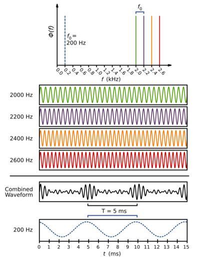 | Keywords: Beat frequency (2000, 2200, 2400, 2600).svg en A diagram showing four sinusoids of frequencies 2000 2200 2400 and 2600 hertz green purple orange and red Also shown is the summed signal black and the sinusoid with the same period as the beat frequency f<sub>0</sub> 200 Hz Above is the spectrum of the signals own Inductiveload 2009-02-15 Beat frequencies Audiology Sensory Neuroscience Hearing and speech | ||||