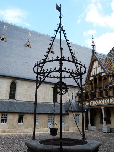 Keywords: beaune france burgundy middle ages hospice hotel de dieu roof brick fountain bucket wrought iron building architecture historically space unesco world heritage old town unesco world heritage