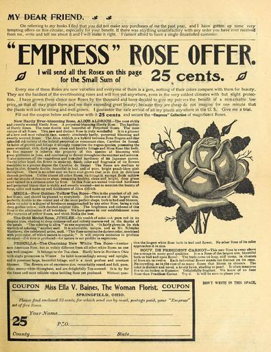 | Keywords: Beautify your homes (15729969933).jpg MY DEAR FRIEND a <br> On referring to my books I find that you did not make any purchases of me the past year and I have gotten up some very- <br> tempting offers on this circular especially for your benefit If there was anything unsatisfactory with any order you have ever received <br> from me write and tell me about it and 1 will make it right I cannot afford to have a single dissatisfied customer <br> EMPRESS ROSE OFFER <br> I will send all the Roses on this page <br> for the Small Sum of <br> 25 cents <br> Every one of these Roses are new varieties and everyone of them is a gem nothing of their colors compare with them for beauty <br> They are the hardiest of the everblooming roses and will live out anywhere even in the very coldest climates with but slight protec- <br> tion I have grown these choice new Roses by the thousand and have decided to give my patrons the benefit of a remarkable low <br> price so that all may plant them and see their exceeding great beauty; because they are cheap do not imagine for one minute that <br> the plants will not be strong and well grown I guarantee the safe arrival of all my plants anywhere in the U S Give me a trial <br> Fill out the coupon below and enclose with it 25 cents and secure the Empress Collection of magnificent Roses <br> New Hardy Ever-blooming Rose ALICE ADDRIOH The most richly <br> and sweetly scented Hardy Rose A perpetual-blooming Hardy Rose The hardiest <br> of Hardy Koses The most double and beautiful of Perpetual Roses The most <br> unique of all Roses This new and distinct Rose is truly wonderful It is a pioneer <br> of a new and most valuable race namely absolutely hardy perpetual blooming and <br> sweetly scented Roses The Alice Aldrich is a hybrid between Rosa Rugosa and that <br> splendid old variety of the hybrid perpetual or remontant class Caroline de Sansal <br> In habit of growth and foliage it strongly resembles the rugosa species possessing the <br> same abundant rich dark green clean and healthy foliage and Moss Rose-like buds <br> In like manner it inherits the property of this species of blooming with <br> great profusion in June and continuing to flower throughout the summer and autumn <br> It also possesses all the ruggedness and iron-clad hardiness of its Japanese parent <br> On the other hand the flower in make-up finish color and fragrance of its flowers <br> resembles to a greater degree the Caroline de Sansal The Roses are medium to <br> large in size densely double beautiful in bud and of pure bright peach-blow pink <br> throughout There is no other rose we have ever grown that is so rich in delicious <br> damask perfume Unlike almost all other Roses its foliage is exempt from mildew <br> and the attacks of insects or slugs remaining healthy clean and bright deep green <br> until turned to a crimson color by frost In this Rose are united iron-clad hardiness <br> and perpetual bloom that is richly and sweetly scented not to mention the beauty of <br> form color and make-up and doubleness of Alice Aldrich <br> MEDIA New Golden- Yellow Tea Rose This is the grandest of all yel- <br> low Roses and should be planted by everybody Its flowers are of the largest size <br> perfectly double to the center and of the most perfect shape both in bud and blossom <br> while its color is a degree of loveliness unapproached by any other Rose beiag a rich <br> deep golden-yellow with decided sulphur tints The brightness and richness of this <br> Rose is the admiration of all beholders We have grown in our establishment some <br> fifty varieties of yellow Roses and think Media the best <br> The Gold Medal Rose JUBILEE Its wealth of color A pure red in its <br> deepest tone shading to deep crimson-red and velvety maroon-red in the depths of <br> the petals The coloring is alive as one expressed it It fairly glows in its rich <br> warmth of coloring another said It is admirable unique and as Mr Schnyler <br> Matthews the celebrated artist said This Rose contains the darkest eclor combined <br> with pure color of which nature is capable It will require centuries to produce <br> its equal if it ever is produced for nature i3 not prolific in repititions <br> PRISOILLiA The Charming New White Tea Rose Another <br> new American Rose but as widely different from all other white Roses as one <br> can well imagine It belongs to the Tea class Hardy here in Northern Ohio <br> with slight protection in Winter Its habit is exceedingly strong and upright <br> and it possesses large beautiful foliage and is a most profuse and constant <br> bloomer The flowers are of enormous size remarkably round and full pure <br> clear snowy-white throughout and are delightfully Tea-scented It is by far <br> the finest and most reliable white bedding Rose yet produced Without ques- <br> tion the largest white Rose both in bud and flower No other Rose of its color <br> approaches it in size <br> SOUV DE PRESIDENT OARNOT This new Rose is away above <br> the average in many good qualities It is a Rose of the largest size beautiful <br> both in bud and open flower The buds come on long stiff stems in clusters <br> of from six to twelve Each individual flower stands out distinct on its stem <br> No crowding as in the case of so many Roses that bloom in clusters The <br> color is distinct and novel a lovely fawn shading to pearl It often measures <br> five to six inches in diameter Delightfully fragrant We know of no finer <br> Rose than President Carnot Try it It will be sure to please you <br> coupon Miss Ella V Baines The Woman Florist coupon <br> SPRINGFIE LD OHIO <br> Please find enclosed 25 cents for which send me by mail postage paid your Empress' <br> set of five Moses <br> 25 <br> County <br> Your Name <br> PZO <br> State <br> DON'T WRITE IN THIS SPACE 41878669 131125 64689 Text http //www biodiversitylibrary org/page/41878669 1918 10 1080/00222939708680643 Ella V Baines Firm ; Henry G Gilbert Nursery a