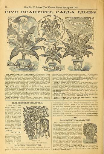 | Keywords: Beautify your homes (16162509280).jpg 10 <br> Miss Ella V Baines The Woman Florist Springfield Ohio <br> FIVE BB AXTCM XJI GAJL JL J± X IT/EE i <br> Sew Baby Calla Lily Little Gem ” This Calla only grows <br> about six to eight inches high and is the freest blooming of all <br> the Callas The bloom is pure white The following facts will <br> convince any one of its great superiority over the old sort Of <br> dwarf habit; the same plant will grow and bloom for years <br> without once ceasing and the quantity of bloom which a good <br> plant will produce is astonishing A large plant is hardly ever <br> without one or more flowers All in all it is one of the most de- <br> sirable plants I have ever offered 15 cents each <br> Tlie Black Calla ” Its flowers are enormous fnlly a foot in <br> length Color a clear coal black so intense that it really shows <br> a brilliancy and as may well be imagined it is a flower of most <br> striking oddity and beauty The bulbs are large and should be <br> potted in the Fall and when growth commences set iu a win- <br> dow After blooming the foliage will die down and the bulbs <br> should be kept dry for replanting in the Fall Price of large <br> flowering bulbs 25 cents each <br> Calla Richardia ” Spotted Calla Plant with beautiful <br> spotted leaves It flowers abundantly during the Summer <br> months when planted out in the open border The flowers are <br> shaped like those of a Calla aud are pure while shaded with <br> violet inside Keep dry in Winter and start in the Spring like a <br> Dahlia The plant belongs to the same order as Calla Ethiopi- <br> ca Price blooming bulbs 15 centseach Larger size to pro- <br> duce a dozen blooms 25 cents each <br> Calla Ethiopica ” Egyptian Lily This is the well-known <br> Egyptian Lily or Lily of the Nile with large white flowers <br> broad foliage and it will prosper under very adverse circum- <br> stances If you want large Callas send to me as I am head- <br> quarters for them I have three sizes Price small plants to <br> bloom next Winter 10 cents each; strong blooming bulbs 25 <br> cents each; mammoth bulbs to make ten to twelve blooms 50 <br> cents each <br> Calla Hastata ” This is the yellow Calla It is just like the <br> others only the flower i« a lemon yellow It is very distinct and <br> will enrich any one s collection 20 Cents each <br> SPECIAL OFFER The set of five distinct Callas <br> all blooming bulbs for 60 cents <br> CLERODENDRON BALEOTJRII <br> A plant of great <br> beauty Makes a grand <br> bedding plant where <br> both foliage and bloom <br> are desired The flow- <br> ers which are of a <br> bright scarlet are en- <br> cased by a bag - like <br> calyx of pure white <br> the trusses or panicles <br> of flowers are upwards <br> of six inches in length <br> and when trained upon <br> trellises and hangiug <br> down have a rich and <br> elegant appearance <br> Price 5 centseach <br> CRAPE <br> MYRTLE <br> Handsome shrubs <br> when in bloom The <br> flowers cover the- en- <br> tire plant Hardy in <br> the South We have balfourii <br> three kinds m the fol- <br> lowing colors ” pink crimson and purple 5 cents each <br> CALADITJM ESCULENTUM <br> One of the most beautiful and striking ornamental-fohaged <br> plants in cultivation either for culture in large pots or tubs or <br> for plantingout on the lawn Will grow in any garden soil and <br> is of the easiest culture When of full size it stands about five <br> feet high with immense leaves often measuring four feet in <br> length by two and one-half in breadth Smooth of bright green <br> color beautifully veined and variegated with dark green The <br> roots should be preserved in dry sand m the cellar during Win- <br> ter out of danger from frost Price good bulbs 10 cents each; <br> large bulbs 25 cents each; extra large bulbs 50 cents each <br> FANCY-LEAVED CALADIUMS <br> These plants are especially valuable for <br> decorating conservatories window boxes <br> and as specimen plants They are mag- <br> nificent planted in beds outdoors noth- <br> ing being more showy The brilliant <br> cardinal red cream pink white and <br> various shadesof green that are displayed <br> in the veimngsand blotches of the leaves <br> cannot be obtained in any other class of <br> plants For arranging floral baskets or <br> table decorations they are qu'te as hand- <br> some as any flower We have a fine col- <br> lection of first-class distinct brilliantly- <br> marked varieties t'sually the bulbs of <br> Fancy Caladiums that are sent out are so <br> small as to tail to grow We have been <br> fortunate in securing a stock of extra <br> larce bulbs Try them Price well- <br> dried extra large bulbs our selection of sorts 25 <br> centseach These are the finest bulbs you ever saw <br> of Fancy Caladiums <br> FANCY CALAPIUMS 41878697 131125 64689 Page 10 Text http //www biodiversitylibrary org/page/41878697 1918 10 1080/00222939708680643 Ella V Baines Firm ; Henry G Gilbert Nursery and Seed Trade Catalog Collection NameFound Clerodendron NameConfirmed Clerodendron EOLID 13174936 NameBankID 276907 NameFound Ethiopica NameConfirmed Ethiopica EOLID 66302 NameBankID 4162235 NameFound Richardia NameConfirmed Richardia EOLID 29640 NameBankID 387684 Biodiversity Heritage Library Beautify your homes 1901 Garden Stories Bulbs Plants Catalogs Flowers Plants Ornamental Roses Seed industry and trade Seeds Trade catalogs U S Department of Agriculture National Agricultural Library bhl page 41878697 dc identifier http //biodiversitylibrary org/page/41878697 bhlGardenStories BHLinbloom bulbs plants plants ornamental u s department of agriculture national agricultural library bhlgardenstories bhlinbloom Information field Flickr posted date ISOdate 2015-01-23 Check categories 2015 August 24 CC-BY-2 0 BioDivLibrary https //flickr com/photos/61021753 N02/16162509280 2015-08-24 08 52 45 cc-by-2 0 PD-old-70-1923 Beautify your homes Photos uploaded from Flickr by Fæ using a s