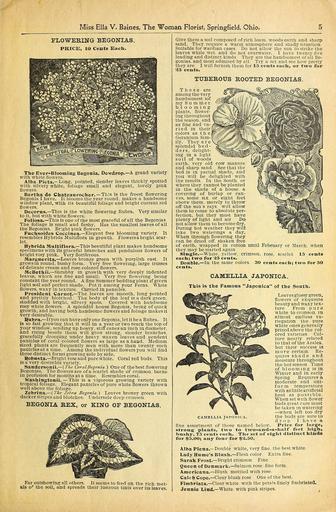 | Keywords: Beautify your homes (16163976317).jpg Miss Ella V Baines The Woman Florist Springfield Ohio <br> FLOWERING BEGONIAS <br> PRICE 10 Cents Each <br> The Ever-Blooming Begonia Dewdrop A grand variety <br> with white flowers <br> Alba Picta Long pointed slender leaves thickly spotted <br> with silvery white foliage small and elegant lovely pink <br> flowers <br> Bertha de Chateaurocher This is the freest flowering <br> Begonia I have It blooms the year round makes a handsome <br> window plant with its beautiful foliage and bright currant red <br> flowers <br> Decorus This is the white flowering Rubra Very similar <br> to it but with white flowers <br> Foliosa This is one of the most graceful of all the Begonias <br> The foliage is small and fleshy Has the smallest leaves of all <br> the Begonias Bright pink flowers <br> Fuchsoides Coccitiea Elegant free blooming variety It <br> resembles Hybrida Multiflora in growth Flowersabnght scar- <br> let <br> Hybrida Multiflora This beautiful plant makes handsome <br> specimens with its graceful branches and pendulous flowers of <br> bright rosy pink Very floriferous <br> Marguerita Leaves bronze green with purplish cast It <br> grows in round bushy form Very free flowering large trusses <br> of delicate cream and rose colored flowers <br> McBethii Shrubby in growth with very deeply indented <br> leaves which are fine and small Very free flowering being <br> constant the year round A fine Summer bedding plant if given <br> light soil and perfect shade Put it among your Ferns White <br> flowers waxy in texture Carried in panicles <br> President Carnot The leaves are smooth long pointed <br> and prettily blotched The body of the leaf is a dark green <br> studded with bright silvery spots Covered with handsome <br> rosy white flowers A splendid house Begonia being of quick <br> growth and having both handsome flowers and foliage makes it <br> very desirable <br> Rubra If you can have only one Begonia let it be a Rubra It <br> is so fast growing that it will in a year or two reach the top of <br> your window sending up heavy stiff canes an inch in diameter <br> and rising beside them will grow strong slender branches <br> gracefully drooping under heavy waxen leaves and pendent <br> panicles of coral colored flowers as large as a hand Medium <br> sized plants are frequently seen with more than twenty such <br> panicles at a time Among the individual flowers you will find <br> three distinct forms growing side by side <br> Robusta Bright rose and pure white Coral red buds This <br> is a very desirable variety <br> Sandersouii The Coral Begom'a One of the best flowering <br> Begonias The flowers are of a scarlet shade of crimson borne <br> in profusion for months at a time Resembles coral <br> Washingtonii This is a vigorous growing variety with <br> tropical foliage Klegant panicles of pure white flowers thrown <br> well above the foliage <br> Zebrina The Zebra Begonia Leaves bronzy green with <br> darker stripes and blotches Underside deep crimson <br> BEGONIA REX or KING OF BEGONIAS <br> Far outshowing all others It seems to feed on the rich met- <br> als o e the soil and spreads their lustrous tints over its leaves <br> Give them a soil composed of rich loam woods earth and sharp <br> sand They require a warm atmosphere and shady situation <br> Suitable for wardian cases Do not allow the sun to strike the <br> leaves while wet and do not overwater I have twentv -five <br> leading and distinct kinds They are the handsomest of all Be- <br> gonias and most admired by all Try a set and see how pretty <br> they are I will furnish them for 15 cents each or two for <br> 25 cents <br> TUBEROUS ROOTED BEGONIAS <br> These are <br> among the very <br> handsomest lof <br> my Summer <br> blooming <br> plants flower- <br> ing throughout <br> the season and <br> as fine and va- <br> ried in their <br> colors as t h e <br> Geranium fam- <br> ily They are <br> splendid bed- <br> ders delight- <br> ing in a light <br> soil of woods <br> earth very old cow manure <br> and sharp'sand See that the <br> bed is in partial shade and <br> you will be delighted with <br> the results In the South or <br> where they cannot be planted <br> in the shade of a house a <br> covering of burlap or can- <br> vas some six or eight feet <br> above them merely to throw <br> off the sun's rays will allow <br> them to come to absolute per- <br> fection but they must have <br> plenty of light and air Do <br> not allow them to become dry <br> During hot weather they will <br> take two waterings a day <br> When through flowering they <br> can be dried off shaken free <br> of earth wrapped in cotton until February or March when <br> they may be started again <br> Single White yellow crimson rose scarlet 15 cents <br> each; two for 25 cents <br> Double In the same colors 30 cents each; two for 50 <br> cents <br> CAMELLIA JAPONICA <br> This is the Famous Japonica of the South <br> Leaves glossy green <br> flowers of exquisite <br> beauty and waxy tex- <br> ture From pure <br> white to crimson in <br> almost endless va- <br> riegation the pure <br> white ones generally <br> prized above the col- <br> ored varieties Cul- <br> ture nearly related <br> to that of the Azalea <br> but their success is <br> more certain Re- <br> quires shade and <br> moisture throughout <br> thehotseason Time <br> of blooming is in <br> Winter and in early <br> Spring Requires a <br> moderate and uni- <br> form temperature <br> with aslittleartificial <br> heat as possible <br> When set with flower <br> buds great care must <br> be taken in watering <br> when left too dry <br> the buds are sure to <br> drop I have a <br> Price for large <br> half feet high <br> CAMELLIA JAPONICA <br> fine assortment of those named below <br> strong plants two to two-and- <br> Imsliy 75 cents each The set of eight distinct kinds <br> for 5 00; any four for 2 50 <br> Alba Plena - Double white very fine the best white <br> Lady Hum
