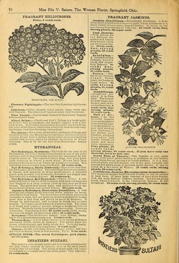 Keywords: Beautify your homes (16164013607).jpg 16 <br> Miss Ella V Baines The Woman Florist Springfield Ohio <br> FRAGRANT HELIOTROPES <br> Price 6 cents each <br> HELIOTROPE THE QUEEN <br> Florence Nightingale The best free flowering light laven- <br> der <br> Chieftain Color deepest violet purple large white eye <br> very fragrant The plant is of vigorous habit very fioriferous <br> Snow 'Wreath- Superb large clusters of deliciously fragrant <br> flowers of pure while <br> Albert Delaux Purple and Gold Foliage is a bright gold- <br> en yellow very pronounced and marked slightly with a del- <br> icate green In bloom it is exquistely beautiful the deep laven- <br> der color of the flower contrasting admirably with the ever-vary- <br> ing foliage very free flowering trusses large <br> The Queen For a neat dwarf habit profusion of bloom and <br> richness of odor this Heliotrope has no equal and its vivid color <br> of royal purple with a distinct white center givesus something <br> entirely new in color either for Summer decoration or Winter <br> flowering This is by far the best of all Heliotropes Simply <br> grand <br> HYDRANGEAS <br> New Hydrangea Monstrosa This is by far the best of all <br> Hydrangeas the flower being almost double in size of the older <br> varieties and its free blooming qualities are unequaled by any <br> plant we know of The color is at first a deep rich pink grad- <br> ually changing to almost a snow white Blooms have been <br> ’measured fifteen inches m length by ten inches through It is <br> indeed an enormousand beautiful flower 10 cents eacb <br> New Hydrangea Stella Fimforiata This is the only dou- <br> ble Hydrangea in existence The individual flowers are perfect- <br> ly double and resemble in shape small rosettes a beautiful <br> peach pink in color very fioriferous flowers of the largest size <br> It is certainly a charming plant 10 cents each <br> New Hydrangea Red-Branched Rami's Pictus A val- <br> uable addition to the list of Hydrangeas with dark red branches <br> that brighten to a clear crimson color as they near the flower <br> trusses The plant is of robust habit and produces freely im- <br> mense heads of deep rose colored flowers 10 cents each <br> Japanese Hydrangea Paniculata Grandiflora A very <br> striking and elegant hardy flowering shrub suitable for lawns; <br> introduced from Japan The flowers are pure white afterwards <br> changing to pink and are borne in immense pyramidal trusses <br> more than a foot long and nearly as much in diameter It <br> blooms in mid-Summer and remains in bloom two or thTee <br> months It creates a great sensation wherever seen The plant <br> is of bushy and compact growth attains a height of three to <br> four feet Perfectly hardy in all parts of the country Needs no <br> protection Fine young plants 20 cents each; extra strong <br> two-year-old plants for immediate effect 35 cents each <br> Hortensis The old favorite variety Pink flowers chang- <br> ing to blue in soils containing iron 8 cents each <br> Thomas Hogg A pure white variety with trusses of flowers <br> measuring fifteen inches in diameter The plants when full <br> grown attain a height and width of six feet Perfectly hardy <br> One of the finest plants for cemeteries 8 cents each <br> Otaksa Bright rosy pink flowers always perfect and last- <br> ing when in bloom three or four months Try it 8 cts each <br> SPECIAL OFFER The seven Hydrangeas good plaMts <br> for 60 cents <br> IMPATIENS STJLTANI <br> This makes a very shapely plant and is in bloom continuously <br> the year round outdoor or indoors even in the small plants <br> three or four inches high The bloom is bright pink and comes <br> s-o profusely as to almost cover the entire plant Very desirable <br> 10 cents each <br> FRAGRANT JASMINES <br> Jasmine Gracillimum Exceedingly fioriferous A flow- <br> ering shoot is produced from every joint which terminates in a <br> dense cluster of pure white fragrant flowers In bloom in the <br> greenhouse from October to February 10 cents each; fine <br> strong plants 30 cents each <br> Cape Jasmine <br> Well known for <br> its delicious fra- <br> grance and beauty <br> of its flowers whieh <br> are white and dou- <br> ble 10 cts each; <br> fine strong <br> plants 35 cents <br> each <br> R e vol u turn <br> A yellow-flowered <br> Jasmine nearly <br> hardy and exquis- <br> itely fragrant 8c <br> each; fine <br> strong plants <br> J5 cents each <br> Poetica Sim- <br> ilar to the Jasmine <br> Grand Flower <br> small but borne on <br> larger spikes 8c <br> each; strong <br> plants 25 cents <br> each <br> Grandiflorum <br> California Jas- <br> mine It is from <br> Italy The flowers <br> are pure white star- <br> shaped and of ex- <br> quisitefragrance 8 <br> cents each; fine <br> strong plants <br> 25 cents each <br> Maid of Or- <br> leans In this <br> beautiful Jasmine <br> th ere are combined <br> some sterling qual- <br> ities that place it a <br> peer over existing <br> sorts Easy culture <br> fine grower good <br> bloomer elegant <br> fragrance and <br> double flowers of <br> chaste and waxy <br> white appearance <br> Fine plants 10 <br> cents each; <br> strong plants 40 cents each If yon have only one <br> Jasmine let it be this one <br> Grand Duke of Tuscany This Jasmine is very easily <br> grown even small plants bearing a profusion of very double <br> cream white flowers having a delicious perfume It is a mag- <br> nificent plant and will become one of the most valuable and <br> popular pot plants when it becomes better known It can be <br> stored in a dry cellar in Winter 20 cents each; strong <br> plants 50 cents each <br> Confederate Jasmine Rhyncospermum Jasminoides <br> I his makes an elegant hard-wooded climber or can be trained <br> in bush form It bears large bunches of pure white flowers <br> with the most delicate Jasmine perfume It is known in the <br> South where it is hardy as the Confederate Jasmine It will <br> delight all 10 cents