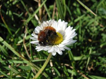 Keywords: Bee on flower 2.JPG A female Andrena fulva imago on common daisy 2006-04-06 Thue Andrena fulva