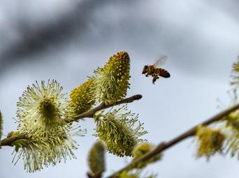Keywords: bee spring blossom bloom pollination insect collect pollen flight bee on flower collect flower plant bee in the approach