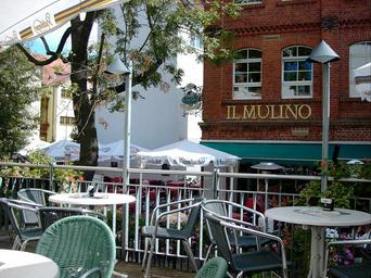 Keywords: beer garden terrace dining tables chairs parasol building gastronomy