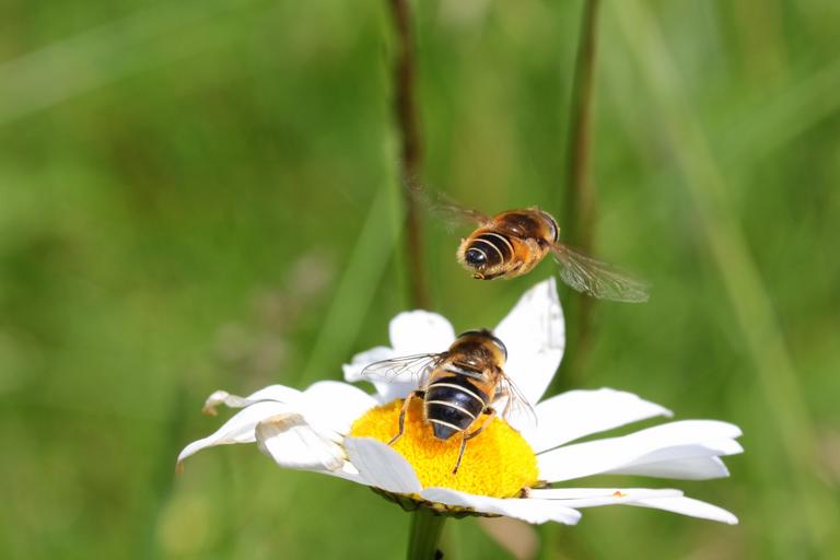 Keywords: bees common sand bees andrena flavipes hymenoptera insect sitting flying marguerite nature animals foraging collect nectar summer