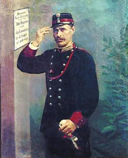 | Keywords: BehrensKurpolizist.jpg 1898 oil on canvas 69 x 55 5 cm Touriseum - Landesmuseum für Tourismus - Schloss Trauttmansdorff object history exhibition history credit line signed and dated bottom left F Behrens / Meran 98 / P ortraitmaler accession number 4070097 Ferdinand Behrens 1898 portrait paintings History of Meran 19th-century portrait paintings of men at three-quarter length Uniforms of Austria PD-Art ImageNote 1 51 42 58 141 483 600 2 Meraner Kur-Ordnung Das Rauchen und Nachschleifen der Schleppe ist untersagt ImageNoteEnd 1 |