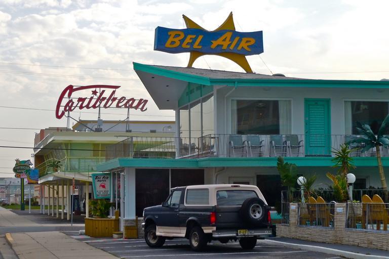 | Keywords: Bel Air DooWop WCNJ.jpg en Bel Air and Caribbean Motel signs in Wildwood Crest New Jersey The Caribbean Motel on NRHP since August 24 2005 At 5600 Ocean Ave in Wildwood Crest south of Wildwood New Jersey in Cape May County Built 1958 in a distinctive modern Las Vegas Jetsons style aka Googie style or locally Doo-Wop Photographer facing south 2011-04-23 own Smallbones cc-zero Uploaded with UploadWizard Caribbean Motel Googie architecture | ||||