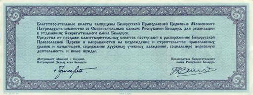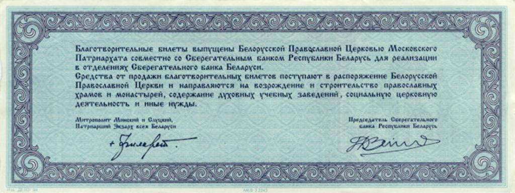 | Keywords: BelarusPNL-1000Rubles-SberegatelniyBankRespublikiBelarus-1994-donatedfvt b.jpg  Благотво ительный билет Бело усской П авославной Це кви  П и Сбе егательного банка Республики Бела усь 1000  ублей 1994  еве с Transferred from http //ru wikipedia org ru wikipedia<br/> Original text скан 1994<br/> 2007 09 23 original upload date Госуда ственный Сбе егательный банк Бело уссии Original uploader was Vizu at http //ru wikipedia org ru wikipedia PD-BY-EXEMPT PD-BY-exempt original upload log page ru wikipedia BelarusPNL-1000Rubles-SberegatelniyBankRespublikiBelarus-1994-donatedfvt_b jpg 2007-09-23 02 42 Vizu 618×232× 63701 bytes <nowiki> Описание Авто В емя создания Источник </nowiki> Filaret Metropolitan of Minsk and Slutsk |