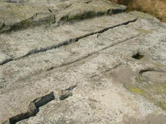 Keywords: Belintash-stonecuts-2.JPG Успо едните п о ези на итуалната площадка на платото на Белинташ Родопите Бълга ия The parallel stone-cuts on the ritual platform on the plateau of Belintash Rhodope mountain Bulgaria Own 2007-08-11 Vassia Atanassova - Spiritia Public domain content created by the uploader Belintash