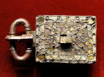 | Keywords: Belt Buckle, about 520-560 AD, Visigothic, Spain, bronze with garnets, glass, mother of pearl, gold foil - Cleveland Museum of Art - DSC08474.JPG en Exhibit in the Cleveland Museum of Art Cleveland Ohio USA Photography was permitted in the museum without restriction This artwork is old enough so that it is in the public domain Daderot 2012-09-07 13 43 04 Daderot cc0 cc0 Pre-Romanesque art in the Cleveland Museum of Art Visigothic belt buckles Ancient Germanic belt buckles in the United States |