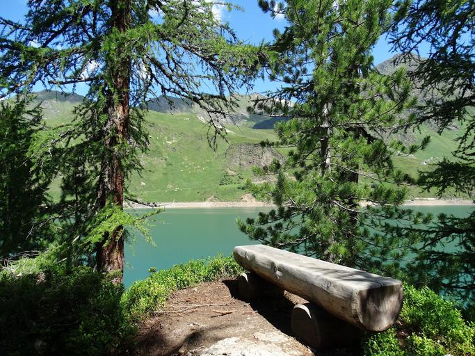 Keywords: bench rest enjoy wooden bench bergsee nature relax recover alpine conifer lake outlook