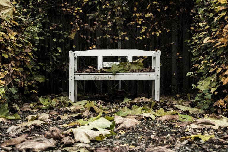 Keywords: bench trees leaves autumn backyard weathered rustic fall environment nature lonely peaceful empty