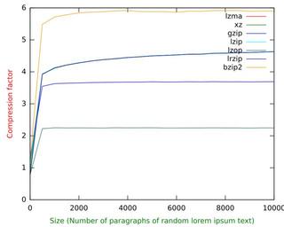 | Keywords: Benchmark common compression formats - Compressing factor.svg en This is a comparison of popular compression formats by how well it compress a file The horizontal scale shows number or paragraphs containing random lorem ipsum text 2011-09-07 own AzaToth other fields G v Following script was used to make the plots They where run on a mounted tmpfs dir Gnuplot bash /bin/bash rm -f compress decompress factor for testnum in seq 0 500 10000 ; do lorem -p testnum > data for archiver in bzip2 lzma xz gzip lzip lzop lrzip; do case archiver in bzip2 suffix bz2;; lzma suffix lzma;; xz suffix xz;; gzip suffix gz;; lzip suffix lz;; lzop suffix lzo;; lrzip suffix lrz;; esac cp data current- testnum s1 stat -c s current- testnum c date + s N archiver current- testnum d date + s N total echo d- c ”ƒ bc echo testnum total >> archiver compress s2 stat -c s current- testnum suffix factor echo scale 10; s1/ s2 ”ƒ bc echo testnum factor >> archiver factor rm -f current- testnum c date + s N archiver -d current- testnum suffix d date + s N total echo d- c ”ƒ bc echo testnum total >> archiver decompress rm -f current rm -f bz2 lzma gz xz lzo lz lrz done done gnuplot < echo set terminal svg;set ylabel 'Time nanoseconds ' textcolor lt 1; set xlabel 'Size Number of paragraphs of random lorem ipsum text ' textcolor lt 2;plot 'lzma compress' title 'lzma' with lines 'xz compress' title 'xz' with lines 'gzip compress' title 'gzip' with lines 'lzip compress' title 'lzip' with lines 'lzop compress' title 'lzop' with lines 'lrzip compress' title 'lrzip' with lines 'bzip2 compress' title 'bzip2' with lines > compress svg gnuplot < echo set terminal svg;set ylabel 'Time nanoseconds ' textcolor lt 1; set xlabel 'Size Number of paragraphs of random lorem ipsum text ' textcolor lt 2;plot 'lzma decompress' title 'lzma' with lines 'xz decompress' title 'xz' with lines 'gzip decompress' title 'gzip' with lines 'lzip decompress' title 'lzip' with lines 'lzop decompress' title 'lzop' with lines 'lrzip decompress' title 'lrzip' with lines 'bzip2 decompress' title 'bzip2' with lines > decompress svg gnuplot < echo set terminal svg;set ylabel 'Compression factor' textcolor lt 1; set xlabel 'Size Number of paragraphs of random lorem ipsum text ' textcolor lt 2;plot 'lzma factor' title 'lzma' with lines 'xz factor' title 'xz' with lines 'gzip factor' title 'gzip' with lines 'lzip factor' title 'lzip' with lines 'lzop factor' title 'lzop' with lines 'lrzip factor' title 'lrzip' with lines 'bzip2 factor' title 'bzip2' with lines > factor svg cc-zero Images with BASH source code |