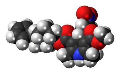 | Keywords: Benidipine-3D-spacefill.png Space-filling model of the benidipine molecule a calcium channel blocker Colour code 505050 Carbon C black<br> F0F0F0 Hydrogen H white<br> F51E1E Oxygen O red<br> 3C50FA Nitrogen N blue<br> 2011-06-13 own DS Visualizer Jynto talk Ball-and-stick version cc-zero Benidipine Images by Jynto Space-filling models |