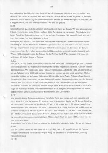 Keywords: Bennewitz Fortsetzung der Chronik zusammengefasst 0020.jpg Bennewitz - Chronik einer Kürschnerfamilie Abschrift der Seite siehe unten Dieser Teil ist überschrieben mit <br/>Fortsetzung der Chronik der Familie Bennewitz in Wurzen Hier in diesem Kasten muß sich die alte Chronik der Familie Bennewitz befinden welche in der Zeit von 1692 bis 1835/39 geschrieben worden ist und Auskunft über die Familie während dieser Zeit gibt Um die Chronik der Familie Bennewitz deren alte Aufzeichnungen vom Jahre 1692 bis 1835/39 sich in dem Buche befinden welches sich in dem vorhergehenden Kasten befindet fortführen zu können ließ ich dieses Buch anfertigen weil das alte Buch keine alten Blätter mehr hatte <br/> Wurzen im August 1909 Ernst Oskar Bennewitz Neun Generationen Kürschnermeister Bennewitz in Wurzen seit 1652 bis zur Flucht 1952 immer an gleicher Stelle Albert-Kuntz-Straße 1 Ecke Schuhgasse Anschließend in Frankfurt/Main Die zehnte Generation Otto Bennewitz jetzt 2010 in Garmisch-Partenkirchen das Haus ist wieder in Familienbesitz Nachfolgend die nochmalige mit einem Texterkennungsprogramm gelesene unkorrigierte Abschrift der abgebildeten Seite Blatt 21 der Abschrift und beschäftige fünf Mädchen Das Geschäft und die Einnahmen November und December sind sehr gut Das kommt auch daher weil alles teurer ist die Vorräte in Familien aufgebraucht deshalb Bedarf ist Durch Vermittlung des Submissionsamtes erhalten wir wieder Militärpelze zu machen Der Krieg geht weiter das Jahr erreicht sein Ende Wir sind alle gesund S 99 Geschäftsbetrieb gut deshalb zufrieden Weihnachten ist Hanni auf Besuch Wir sind alle zusammen fröhlich Es giebt aber keine Stollen weil kein Mehl Schokolade nur ganz wenig Christbäume sind teuer Es soll laut Bekanntmachung nur 1 Licht auf dem Christbaum Wir haben 12 drauf sind noch vom Jahr vorher Das Jahr 1916 geht zu Ende Es beginnt das Jahr 1917 Wir treten das Jahr mit guter Hoffnung an Die Militärpelzarbeit beginnt erst richtig im Januar da die Felle nicht früher geliefert wurden Es wird Januar sehr sehr kalt und strenger langer Winter Infolge der strengen Kälte tritt Kohlenmangel ein Es werden die Schulen zusammengelegt Die Knaben gehen mit in die Mädchenschule Unterricht natürlich jedes für sich Wegen Kohlenmangel werden die Schulen für die Zeit hier hat B Platz gelassen d à ganz geschlossen Wir haben Januar u Februar S 100 sehr oft 15 20 - 25 Grad Kälte Reaumur deshalb auch viel Arbeit Geschäft geht gut Am 1 Februar sollen Bezugscheine auf Filzschuhwaren eingeführt werden folgedessen kauft das Puplikum fast das ganze Lager aus Wir fertigten bis Ende Februar 38 Militärpelze Arbeitslohn 18 50 Mk das Stück Da wir aus Fabriken keine Militärmützen mehr bekommen müssen wir alles selbst anfertigen Alle Lebensmittel giebt es nur auf Karten Mitte März läßt die Kälte nach Es wird Frühling Ostern kommt Es wird schön Die Felder sehen gut aus Es kommt Pfingsten Ernteaussichten sind gut Der Sommer ist recht heiß und trocken so daß Buttermangel eintritt Das Getreide bleibt zurück Die großen Schulferien kommen 15 Juli bis 15 August Infolge vieler Arbeit kommen wir aber nicht dazu Ausflüge und Reisen zu machen Die Ferien nehmen ihr Ende Wegen Ledermangel sollen alle Kinder selbst in hohen Schulen barfuß in die Schule kommen Die Lebensmittel S 101 sind ziemlich knapp Besonders die neuen Kartoffeln Es ist aber immer noch zum aushalten und noch lange nicht zum verhungern Es kommen neue Kriegssteuern Heute am 25 August bietet uns ein Landmann 1 Hähnchen an das Pfund 4 50 bei 2 1/2 Pf schwer also 11 25 Wurde gekauft - Lebensmittelpreise sind jetzt Brot 1 Pf 20 Pf 2 Semmeln 15 Pf Unser Stoff den wir zu Militärmützen nehmen kostet jetzt 1 mtr Rot Tuch 40 - 50 Mark 1 mtr Feldgrau 25 - 45 Mark 1 mtr schwarz 18' 25 - 40 Mark Futterstoff Baumwollen Meter 4 - 6 Mark Unsere Mützen sind natürlich auch dementsprechend teurer geworden jetzt die billigste Militärmütze 5 Mark die beste 12 50 wurden aber immer teurer und teurer In der Nacht vom 2 zum 3 October brannte die Stadtmühle vollständig nieder - Es war ein riesiges Feuer Am 20 October kaufen wir eine Gans a 1 Pf 5 00 Mark bei 12 Pf Mark 60 00 Am 31 October 400jahr Reformations-Jubelfestfeier Wegen Krieg nur bestehend in kirchlicher Feier Festzug Grundsteinlegung S 102 seealso category Furriers Bennewitz in Wurzen Germany Weitere Bilder und Familien- und Firmenchronik Furrier family Bennewitz in Wurzen Germany since 1652 Own Begonnen 1909 Bennew <span class signature-talk >talk</span> 15 04 7 June 2010 UTC Fortsetzung der Chronik der Familie Bennewitz in Wurzen