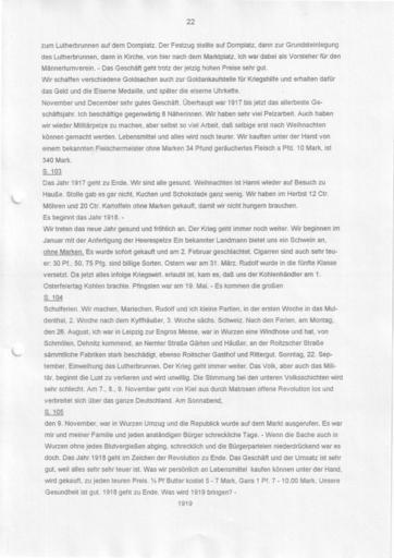 | Keywords: Bennewitz Fortsetzung der Chronik zusammengefasst 0021.jpg  Bennewitz - Chronik einer Kürschnerfamilie Abschrift der Seite siehe unten Dieser Teil ist überschrieben mit <br/>Fortsetzung der Chronik der Familie Bennewitz in Wurzen Hier in diesem Kasten muß sich die alte Chronik der Familie Bennewitz befinden welche in der Zeit von 1692 bis 1835/39 geschrieben worden ist und Auskunft über die Familie während dieser Zeit gibt Um die Chronik der Familie Bennewitz deren alte Aufzeichnungen vom Jahre 1692 bis 1835/39 sich in dem Buche befinden welches sich in dem vorhergehenden Kasten befindet fortführen zu können ließ ich dieses Buch anfertigen weil das alte Buch keine alten Blätter mehr hatte <br/> Wurzen im August 1909 Ernst Oskar Bennewitz Neun Generationen Kürschnermeister Bennewitz in Wurzen seit 1652 bis zur Flucht 1952 immer an gleicher Stelle Albert-Kuntz-Straße 1 Ecke Schuhgasse Anschließend in Frankfurt/Main Die zehnte Generation Otto Bennewitz jetzt 2010 in Garmisch-Partenkirchen das Haus ist wieder in Familienbesitz Nachfolgend die nochmalige mit einem Texterkennungsprogramm gelesene unkorrigierte Abschrift der abgebildeten Seite Blatt 22 der Abschrift zum Lutherbrunnen auf dem Domplatz Der Festzug stellte auf Domplatz dann zur Grundsteinlegung des Lutherbrunnen dann in Kirche von hier nach dem Marktplatz Ich war dabei als Vorsteher für den Männerturnverein - Das Geschäft geht trotz der jetzig hohen Preise sehr gut Wir schaffen verschiedene Goldsachen auch zur Goldankaufstelle für Kriegshilfe und erhalten dafür das Geld und die Eiserne Medaille und später die eiserne Uhrkette November und December sehr gutes Geschäft à berhaupt war 1917 bis jetzt das allerbeste Geschäftsjahr Ich beschäftige gegenwärtig 8 Näherinnen Wir haben sehr viel Pelzarbeit Auch haben wir wieder Militärpelze zu machen aber selbst so viel Arbeit daß selbige erst nach Weihnachten können gemacht werden Lebensmittel und alles wird noch teurer Wir kauften unter der Hand von einem bekannten Fleischermeister ohne Marken 34 Pfund geräuchertes Fleisch a Pfd 10 Mark ist 340 Mark S 103 Das Jahr 1917 geht zu Ende Wir sind alle gesund Weihnachten ist Hanni wieder auf Besuch zu Hauße Stolle gab es gar nicht Kuchen und Schokolade ganz wenig Wir haben im Herbst 12 Ctr Möhren und 20 Ctr Kartoffeln ohne Marken gekauft damit wir nicht hungern brauchen Es beginnt das Jahr 1918 - Wir treten das neue Jahr gesund und fröhlich an Der Krieg geht immer noch weiter Wir beginnen im Januar mit der Anfertigung der Heerespelze Ein bekannter Landmann bietet uns ein Schwein an ohne Marken Es wurde sofort gekauft und am 2 Februar geschlachtet Cigarren sind auch sehr teuer 30 Pf 50 75 Pfg sind billige Sorten Ostern war am 31 März Rudolf wurde in die fünfte Klasse versetzt Da jetzt alles infolge Kriegswirt erlaubt ist kam es daß uns der Kohlenhändler am 1 Osterfeiertag Kohlen brachte Pfingsten war am 19 Mai - Es kommen die großen S 104 Schulferien Wir machen Mariechen Rudolf und ich kleine Partien in der ersten Woche in das Muldenthal 2 Woche nach dem Kyffhäußer 3 Woche sächs Schweiz Nach den Ferien am Montag den 26 August ich war in Leipzig zur Engros Messe war in Wurzen eine Windhose und hat von Schmölen Dehnitz kommend an Nemter Straße Gärten und Häußer an der Roitzscher Straße sämmtliche Fabriken stark beschädigt ebenso Roitscher Gasthof und Rittergut Sonntag 22 September Einweihung des Lutherbrunnen Der Krieg geht immer weiter Das Volk aber auch das Militär beginnt die Lust zu verlieren und wird unwillig Die Stimmung bei den unteren Volksschichten wird sehr schlecht Am 7 8 9 November geht von Kiel aus durch Matrosen offene Revolution los und verbreitet sich über das ganze Deutschland Am Sonnabend S 105 den 9 November war in Wurzen Umzug und die Republick wurde auf dem Markt ausgerufen Es war mir und meiner Familie und jeden anständigen Bürger schreckliche Tage - Wenn die Sache auch in Wurzen ohne jedes Blutvergießen abging schrecklich und die Bürgerparteien niederdrückend war es doch Das Jahr 1918 geht im Zeichen der Revolution zu Ende Das Geschäft und der Umsatz ist sehr gut weil alles sehr sehr teuer ist Was wir persönlich an Lebensmittel kaufen können unter der Hand wird gekauft zu jeden teuren Preis 1/2 Pf Butter kostet 5 - 7 Mark Gans 1 Pf 7 - 10 00 Mark Unsere Gesundheit ist gut 1918 geht zu Ende Was wird 1919 bringen ﷓ 1919 seealso category Furriers Bennewitz in Wurzen Germany Weitere Bilder und Familien- und Firmenchronik Furrier family Bennewitz in Wurzen Germany since 1652 Own Begonnen 1909 Bennew <span class signature-talk >talk</span> 15 04 7 June 2010 UTC Fortsetzung der Chronik der Familie Bennewitz in Wurzen |
