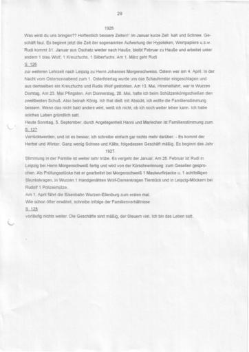 Keywords: Bennewitz Fortsetzung der Chronik zusammengefasst 0028.jpg Bennewitz - Chronik einer Kürschnerfamilie Abschrift der Seite siehe unten Dieser Teil ist überschrieben mit <br/>Fortsetzung der Chronik der Familie Bennewitz in Wurzen Hier in diesem Kasten muß sich die alte Chronik der Familie Bennewitz befinden welche in der Zeit von 1692 bis 1835/39 geschrieben worden ist und Auskunft über die Familie während dieser Zeit gibt Um die Chronik der Familie Bennewitz deren alte Aufzeichnungen vom Jahre 1692 bis 1835/39 sich in dem Buche befinden welches sich in dem vorhergehenden Kasten befindet fortführen zu können ließ ich dieses Buch anfertigen weil das alte Buch keine alten Blätter mehr hatte <br/> Wurzen im August 1909 Ernst Oskar Bennewitz Neun Generationen Kürschnermeister Bennewitz in Wurzen seit 1652 bis zur Flucht 1952 immer an gleicher Stelle Albert-Kuntz-Straße 1 Ecke Schuhgasse Anschließend in Frankfurt/Main Die zehnte Generation Otto Bennewitz jetzt 2010 in Garmisch-Partenkirchen das Haus ist wieder in Familienbesitz Nachfolgend die nochmalige mit einem Texterkennungsprogramm gelesene unkorrigierte Abschrift der abgebildeten Seite Blatt 29 Schluss der Abschrift 1926 Was wirst du uns bringen Hoffentlich bessere Zeiten Im Januar kurze Zeit kalt und Schnee Geschäft faul Es beginnt jetzt die Zeit der sogenannten Aufwertung der Hypoteken Wertpapiere u s w Rudi kommt 31 Januar aus Oschatz wieder nach Hauße bleibt Februar zu Hauße und arbeitet unter andern 1 blau Wolf 1 Kreuzfuchs 1 Silberfuchs Am 1 März geht Rudi S 126 zur weiteren Lehrzeit nach Leipzig zu Herrn Johannes Morgenschweiss Ostern war am 4 April In der Nacht vom Ostersonnabend zum 1 Osterfeiertag wurde uns das Schaufenster eingeschlagen und aus demselben ein Kreuzfuchs und Rudis Wolf gestohlen Am 13 Mai Himmelfahrt war in Wurzen Domtag Am 23 Mai Pfingsten Am Donnerstag 26 Mai hatte ich beim Schützenkönigschießen den zweitbesten Schuß Also beinah König Ich that dieß mit Absicht ich wollte die Familienstimmung bessern Wenn das nicht bald anders wird weiß ich nicht ob ich noch weiter leben kann Ich habe solches Leben gründlich satt Heute Sonntag 5 September durch Angelegenheit Hanni und Mariechen ist Familienstimmung zum S 127 Verrücktwerden und ist es besser ich schreibe einfach gar nichts mehr darüber - Es kommt der Herbst und Winter Ganz wenig Schnee und Kälte folgedessen Geschäft mäßig Es beginnt das Jahr 1927 Stimmung in der Familie ist weiter sehr trübe Es vergeht der Januar Am 28 Februar ist Rudi in Leipzig bei Herrn Morgenschweiß fertig und wird von der Kürschnerinnung zum Gesellen gesprochen Als Prüfungsstücke hat er gearbeitet bei Morgenschweiß 1 Maulwurfinjacke u 1 achtfelligen Skunkskragen in Wurzen 1 Handgenähten Wolf-Damenkragen Tierstück und in Leipzig-Möckern bei Rudolf 1 Polizeimütze Am 1 April fährt die Eisenbahn Wurzen-Eilenburg zum ersten mal Wie schon öfter erwähnt schreibe infolge der Familienverhältnisse S 128 vorläufig nichts weiter Die Geschäfte sind mäßig der Steuern viel Ich bin das Leben satt seealso category Furriers Bennewitz in Wurzen Germany Weitere Bilder und Familien- und Firmenchronik Furrier family Bennewitz in Wurzen Germany since 1652 Own Begonnen 1909 Bennew <span class signature-talk >talk</span> 15 04 7 June 2010 UTC Fortsetzung der Chronik der Familie Bennewitz in Wurzen |