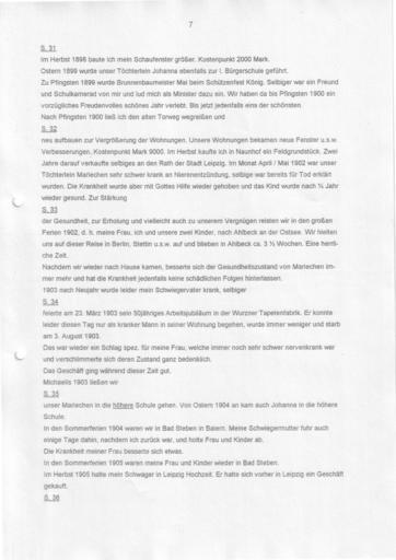 Keywords: Bennewitz Fortsetzung der Chronik zusammengefasst 0006.jpg Bennewitz - Chronik einer Kürschnerfamilie Abschrift der Seite siehe unten Dieser Teil ist überschrieben mit <br/>Fortsetzung der Chronik der Familie Bennewitz in Wurzen Hier in diesem Kasten muß sich die alte Chronik der Familie Bennewitz befinden welche in der Zeit von 1692 bis 1835/39 geschrieben worden ist und Auskunft über die Familie während dieser Zeit gibt Um die Chronik der Familie Bennewitz deren alte Aufzeichnungen vom Jahre 1692 bis 1835/39 sich in dem Buche befinden welches sich in dem vorhergehenden Kasten befindet fortführen zu können ließ ich dieses Buch anfertigen weil das alte Buch keine alten Blätter mehr hatte <br/> Wurzen im August 1909 Ernst Oskar Bennewitz Neun Generationen Kürschnermeister Bennewitz in Wurzen seit 1652 bis zur Flucht 1952 immer an gleicher Stelle Albert-Kuntz-Straße 1 Ecke Schuhgasse Anschließend in Frankfurt/Main Die zehnte Generation Otto Bennewitz jetzt 2010 in Garmisch-Partenkirchen das Haus ist wieder in Familienbesitz Nachfolgend die nochmalige mit einem Texterkennungsprogramm gelesene unkorrigierte Abschrift der abgebildeten Seite Blatt 7 der Abschrift Im Herbst 1898 baute ich mein Schaufenster größer Kostenpunkt 2000 Mark Ostern 1899 wurde unser Töchterlein Johanna ebenfalls zur I Bürgerschule geführt Zu Pfingsten 1899 wurde Brunnenbaumeister Mai beim Schützenfest König Selbiger war ein Freund und Schulkamerad von mir und lud mich als Minister dazu ein Wir haben da bis Pfingsten 1900 ein vorzügliches Freudenvolles schönes Jahr verlebt Bis jetzt jedenfalls eins der schönsten Nach Pfingsten 1900 ließ ich den alten Torweg wegreißen und S 32 neu aufbauen zur Vergrößerung der Wohnungen Unsere Wohnungen bekamen neue Fenster u s w Verbesserungen Kostenpunkt Mark 9000 Im Herbst kaufte ich in Naunhof ein Feldgrundstück Zwei Jahre darauf verkaufte selbiges an den Rath der Stadt Leipzig Im Monat April / Mai 1902 war unser Töchterlein Mariechen sehr schwer krank an Nierenentzündung selbige war bereits für Tod erklärt wurden Die Krankheit wurde aber mit Gottes Hilfe wieder gehoben und das Kind wurde nach 1/4 Jahr wieder gesund Zur Stärkung S 33 der Gesundheit zur Erholung und vielleicht auch zu unserem Vergnügen reisten wir in den großen Ferien 1902 d h meine Frau ich und unsere zwei Kinder nach Ahlbeck an der Ostsee Wir hielten uns auf dieser Reise in Berlin Stettin u s w auf und blieben in Ahlbeck ca 3 1/2 Wochen Eine herrliche Zeit Nachdem wir wieder nach Hause kamen besserte sich der Gesundheitszustand von Mariechen immer mehr und hat die Krankheit jedenfalls keine schädlichen Folgen hinterlassen 1903 nach Neujahr wurde leider mein Schwiegervater krank selbiger S 34 feierte am 23 März 1903 sein 50jähriges Arbeitsjubiläum in der Wurzner Tapetenfabrik Er konnte leider diesen Tag nur als kranker Mann in seiner Wohnung begehen wurde immer weniger und starb am 3 August 1903 Das war wieder ein Schlag spez für meine Frau welche immer noch sehr schwer nervenkrank war und verschlimmerte sich deren Zustand ganz bedenklich Das Geschäft ging während dieser Zeit gut Michaelis 1903 ließen wir S 35 unser Mariechen in die höhere Schule gehen Von Ostern 1904 an kam auch Johanna in die höhere Schule In den Sommerferien 1904 waren wir in Bad Steben in Baiern Meine Schwiegermutter fuhr auch einige Tage dahin nachdem ich zurück war und holte Frau und Kinder ab Die Krankheit meiner Frau besserte sich etwas In den Sommerferien 1905 waren meine Frau und Kinder wieder in Bad Steben Im Herbst 1905 hatte mein Schwager in Leipzig Hochzeit Er hatte sich vorher in Leipzig ein Geschäft gekauft S 36 seealso category Furriers Bennewitz in Wurzen Germany Weitere Bilder und Familien- und Firmenchronik Furrier family Bennewitz in Wurzen Germany since 1652 Own Begonnen 1909 Bennew <span class signature-talk >talk</span> 15 04 7 June 2010 UTC Fortsetzung der Chronik der Familie Bennewitz in Wurzen |