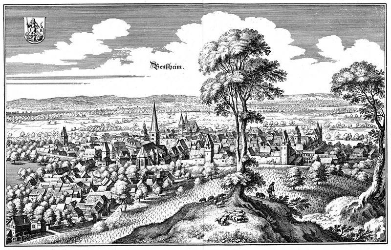 | Keywords: Bensheim Merian 174 5.jpg Ansicht von Bensheim 1646 Kupferstich auf Papier Matthaeus Merian Topopgraphia Hassiae et Regionum Vicinarum Faksimile nach der 2 Auflage 1655 neue Ausgabe Kassel 1959 S 174 žAnsicht von Bensheim 1646 in Historische Ortsansichten http //www lagis-hessen de/de/subjects/idrec/sn/oa/id/2750 1646 creator Matthäus Merian PD-old-100 Historic views of Bensheim Engravings by Matthäus Merian | ||||