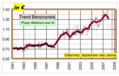 | Keywords: Benzinpreis.png en Statistic of prices for Gasoline in Germany in the Year 1991 - 2009 de Die Entwicklung des Preises für Normalbenzin in Deutschland Unter Nutzung der in der Tankstatistik mit geschriebenen Preise für ein Liter Ausgewertete Aufzeichnungen der Jahre 1991 bis 2009 own Boonekamp 2009-04-25 Gasoline prices |